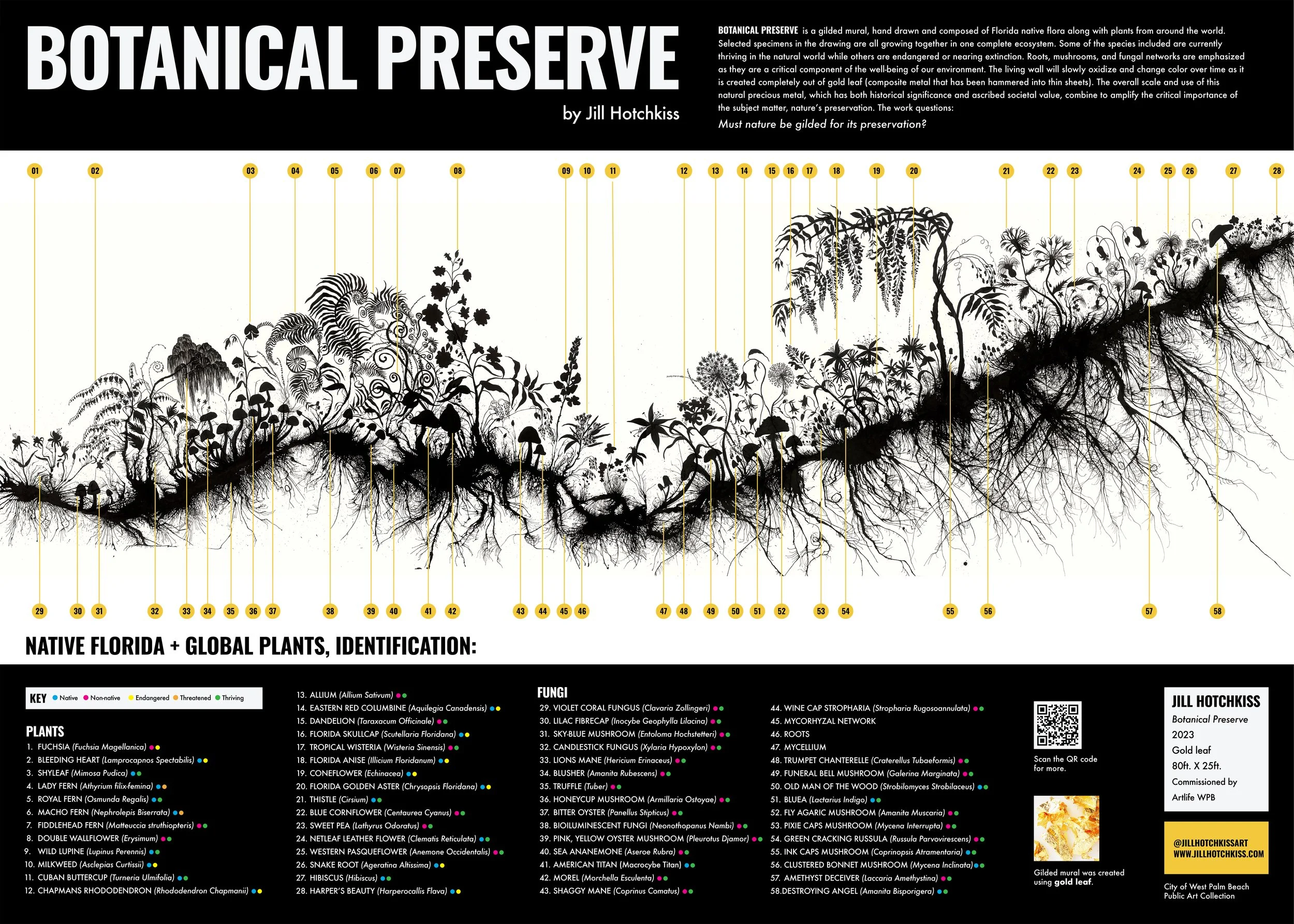 Fine Art Giclee- large format, black and white print on semi-luster paper offered in a variety of sizes of the original drawing used in “Botanical Preserve”- a public art project, gilded mural, 80ft x 25ft, 2023.